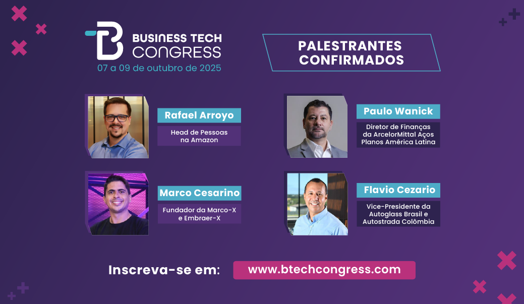 Mais do que um evento, o Business Tech Congress é uma oportunidade de troca, aprendizado e networking para quem deseja ampliar repertório, fortalecer conexões e se atualizar sobre as principais transformações que impactam o mercado e a sociedade.