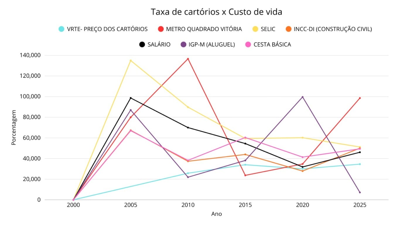 Desde 2001, as taxas cartorárias no Espírito Santo têm como referência o Valor de Referência do Tesouro Estadual (VRTE), que acumulou alta de 308,6% ao longo de 25 anos. Ao mesmo tempo, outros indicadores econômicos avançaram em ritmo muito mais acelerado. O salário-mínimo registrou crescimento acumulado de 743,3%, a cesta básica subiu 671,5% e o IGP-M, índice associado ao preço dos aluguéis, avançou 505,2%.