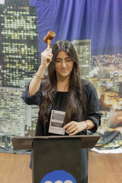 A coordenadora pedagógica do NEP, Josiane Saraiva Nogueira, explica que os estudantes assumem papéis de representantes de diferentes países e trabalham para encontrar soluções viáveis e fundamentadas.