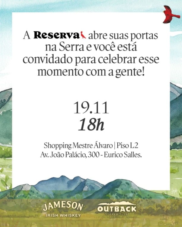Reserva apresenta o pica-pau de fogo e abre as portas no Mestre Álvaro – Uma lenda que nasce na Serra, conta a história de Guaraci e Jaciara, indígenas de etnias rivais, que se amavam em segredo. Para protegê-los, Tupã enviou um pássaro de fogo — uma chama viva que iluminava os seus caminhos. Quando foram descobertos, o casal se transformou nas montanhas Mestre Álvaro e Moxuara. E o pássaro de fogo? Diz a lenda que ele nunca partiu e, todo ano, na noite de São João, retorna para reunir os amantes. Neste mesmo cenário, revivendo a lenda, nasce a nova loja da Reserva, inspirada na força do recomeço, na coragem de brilhar, e o nosso pica-pau de fogo mantendo a chama que nunca se apaga lá no alto. O ponto alto será nesta quarta-feira, a partir das 18 horas.