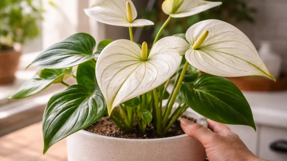 O antúrio de folha branca chama atenção justamente pelo contraste delicado entre o fundo claro e as nervuras marcadas. Quando essas nervuras começam a perder definição e ficam opacas, a frustração aparece rápido. A planta está viva, cresce, emite folhas novas, mas aquele brilho sofisticado simplesmente some. O erro, quase sempre, não está na adubação nem na rega. Está na luz — mais especificamente, na luz repetida sempre do mesmo ângulo.