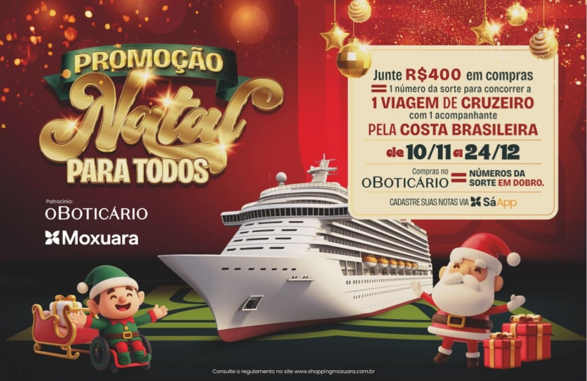 Shopping Moxuara sorteia uma viagem de cruzeiro pela costa brasileira em promoção de Natal – O clima natalino já tomou conta do shopping Moxuara, em Cariacica, e a temporada promete ser ainda mais especial neste fim de ano. Para celebrar o Natal e presentear seus clientes, o shopping acaba de lançar uma promoção imperdível: o sorteio de uma viagem de cruzeiro pela costa brasileira, com acompanhante. De 10 de novembro a 24 de dezembro, juntando R$ 400 em compras realizadas nas lojas participantes, o cliente poderá cadastrar as notas fiscais pelo Sá App e receber um número da sorte para concorrer ao prêmio. As compras feitas nas lojas O Boticário valem cupons em dobro, aumentando as chances de ganhar. Além do cadastro digital, o shopping disponibilizará um balcão de informações ao cliente no Piso L2, em frente à Riachuelo, onde será possível obter informações e suporte durante o período da campanha. O sorteio será realizado no dia 27 de dezembro, via Loteria Federal. De acordo com Tássia de Carvalho, gerente de marketing do shopping Moxuara, a ação foi pensada para proporcionar uma experiência marcante ao público. “Queremos que nossos clientes vivam momentos únicos neste Natal. O cruzeiro é um prêmio especial, que reflete o espírito da data: celebrar, relaxar e compartilhar boas memórias com quem a gente ama”, destaca Tássia.