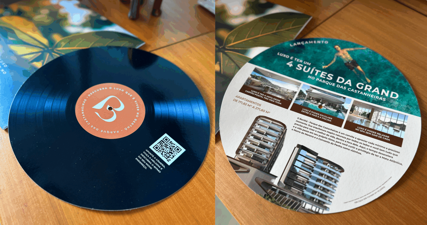 Grand Construtora e MP assinam impresso em formato de vinil que está chamando atenção no mercado – A música foi um elemento que, desde o princípio, inspirou a campanha do Berthô, novo ícone da Grand Construtora no Parque das Castanheiras. A leveza e o romantismo das canções italianas dos anos 60 embalaram a criação da música que é trilha sonora do filme da campanha, ajudando a construir o clima sensorial que diferencia o empreendimento. Para reforçar esse conceito, a MP Publicidade criou um material impresso inusitado: um disco de vinil. Nele, um QR Code convida o público a acessar o filme e ouvir a melodia exclusiva que deu vida à comunicação do Berthô.