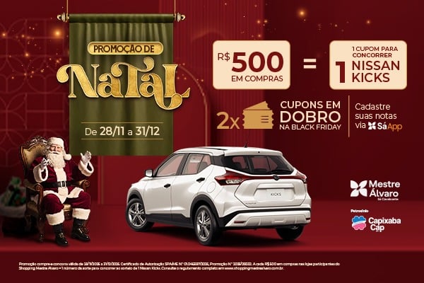 Shopping Mestre Álvaro sorteia um Nissan Kicks 0KM no Natal 2025 – O Natal está ainda mais especial no shopping Mestre Álvaro neste ano. O empreendimento lançou uma campanha promocional que vai presentear um cliente com um Nissan Kicks 0KM, reforçando o clima de celebração e incentivando as compras de fim de ano. A promoção é válida de 28 de novembro a 31 de dezembro de 2025, seguindo a mecânica de números da sorte: juntando R$ 500,00 em compras nas lojas do shopping, o cliente ganha 01 número da sorte para participar do sorteio. A etapa de Black Friday, realizada entre os dias 28 e 30 de novembro, garantiu cupons em dobro aos clientes que compraram nesse período, ampliando suas chances de participação. Agora, a campanha segue normalmente até o fim do mês, com cadastro exclusivo das notas fiscais pelo SáAPP, o aplicativo oficial do shopping.