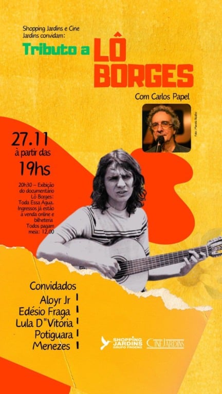 Homenagem a Lô Borges reúne música e cinema no Shopping Jardins – Salomão Borges Filho, o criativo e inesquecível Lô Borges, receberá um tributo especial em sua homenagem. O evento, organizado pelo Shopping Jardins, acontece na próxima quinta-feira (27), às 19h, na praça de alimentação e no cinema. Os ingressos já estão à venda. A programação começa na praça de alimentação, com apresentações dos músicos Carlos Papel, Aloyr Jr., Edésio Fraga, Lula D’Vitória, Potiguara e Menezes, que farão releituras de grandes sucessos de Lô. Em seguida, no Cine Jardins, será exibido o documentário “Lô Borges: Toda essa água”, que revisita sua trajetória: do primeiro álbum solo, lançado aos 20 anos, às turnês pelo país e ao processo criativo de seu último disco, já depois dos 70 anos.