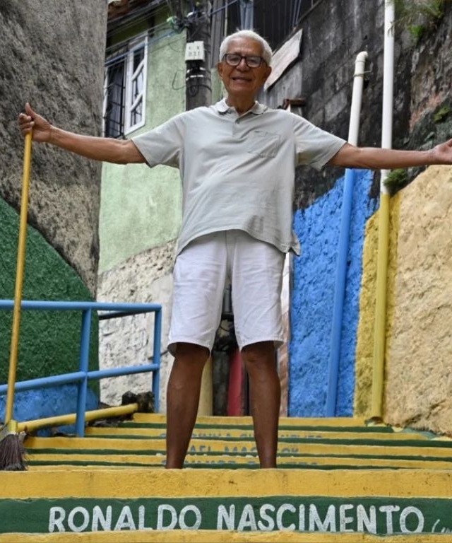 Neste ano, ele não pintou as escadas sozinho e teve ajuda de um morador, que cuidava do agitador cultural e das escadas. Seu Raimundo, como é conhecido na comunidade, adoeceu no processo de reforma, então o amigo Ubirajara Rocha colocava uma cadeira no lado das escadarias e dava sequência para a pintura.