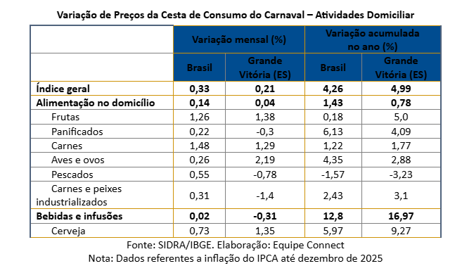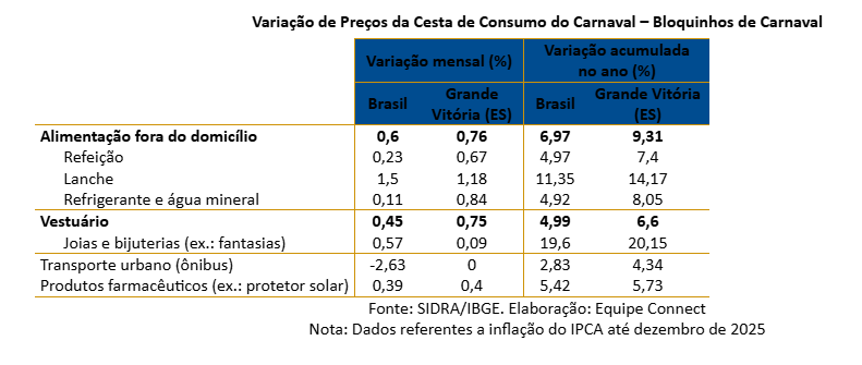 Custos do Carnaval – O Carnaval também se reflete no bolso dos consumidores, que costumam se dividir entre quem permanece em casa, quem participa dos blocos e quem viaja. Na Grande Vitória, a inflação acumulada da cesta de consumo para atividades domiciliares chegou a 4,99% até dezembro de 2025, acima da média nacional (4,26%). A maior pressão veio do grupo bebidas e infusões, com alta de 16,97%, especialmente a cerveja, que acumulou variação de 9,27%. Já a alimentação dentro de casa apresentou inflação mais moderada (0,78%), inferior à média nacional. Alguns itens, como frutas, tiveram aumento mais expressivo, enquanto pescados registraram deflação, ajudando a aliviar parte do custo para quem opta por comemorar em casa.