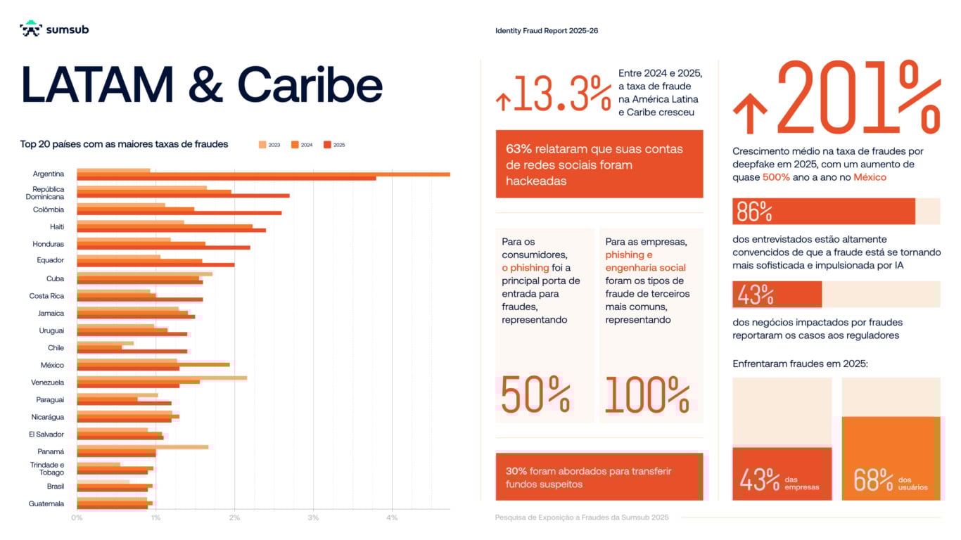 - Crescimento nas fraudes: Entre 2024 e 2025, a taxa de fraudes na América Latina e Caribe aumentou 13,3%, enquanto 86% dos entrevistados disseram que os golpes estão se tornando sofisticados e cada vez mais impulsionados por IA;