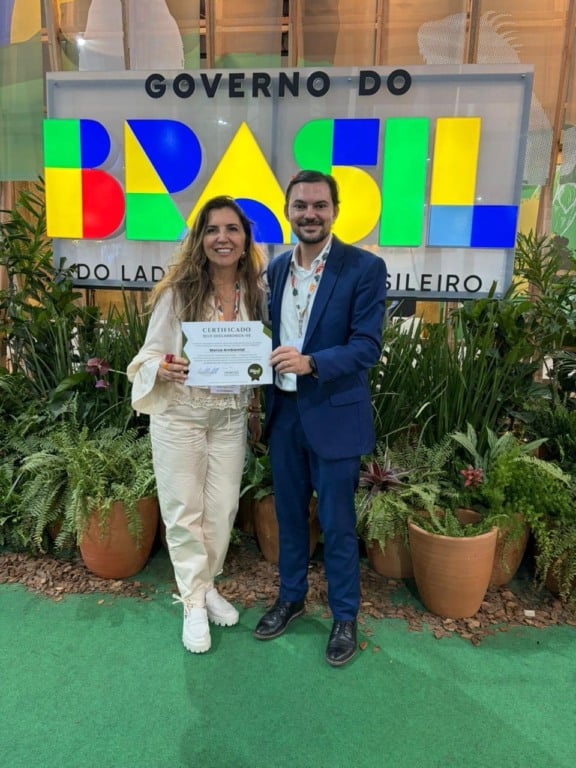 Transparência e competitividade no mercado de carbono – A iniciativa é destinada a empresas com planos de redução de Gases de Efeito Estufa (GEE). Para obter o selo, que terá validade anual e renovável, as companhias precisarão atender a critérios rigorosos, tais como apresentar um inventário detalhado de suas emissões, protocolar um plano de descarbonização válido e comprovar a redução ou compensação de, pelo menos, 5% das emissões dentro do território estadual. Outro pilar do programa será a transparência regulatória. As informações sobre inventários e as reduções certificadas estarão disponíveis em um Registro Eletrônico Público, estabelecendo uma base de dados verificável que suportará o crescente mercado de carbono local e a avaliação de risco climático por investidores. Na foto, Mirela Souto, presidente do Instituto Marca e Gustavo Ribeiro, diretor institucional da Marca Ambiental.