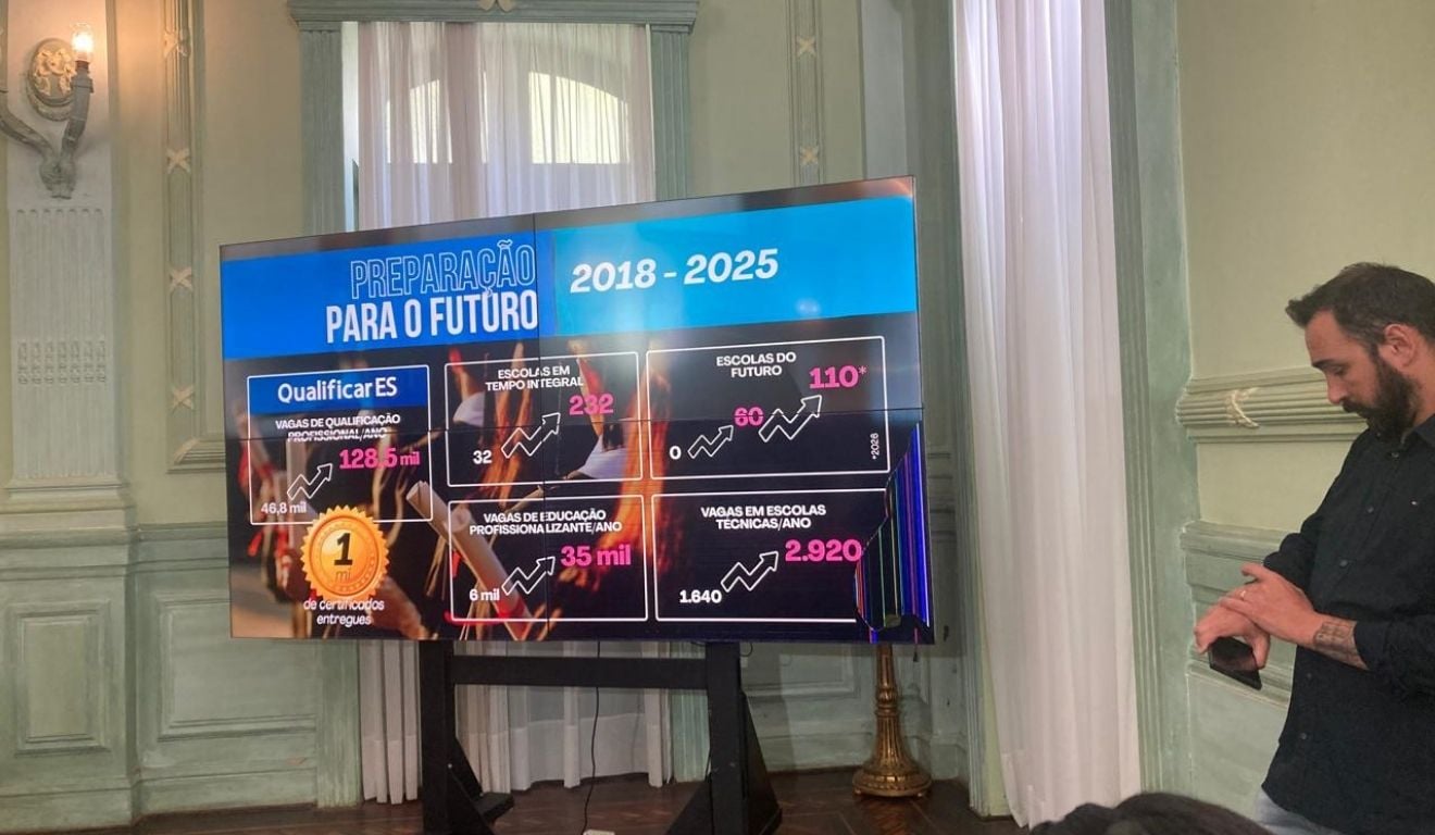 Na área da educação, o governo mostrou a ampliação no número de escolas em tempo integral, que passou de 32 em 2018 para 232 em 2025. A disponibilização de vagas em escolas técnicas passou de 1.640 para 2.920 por ano.