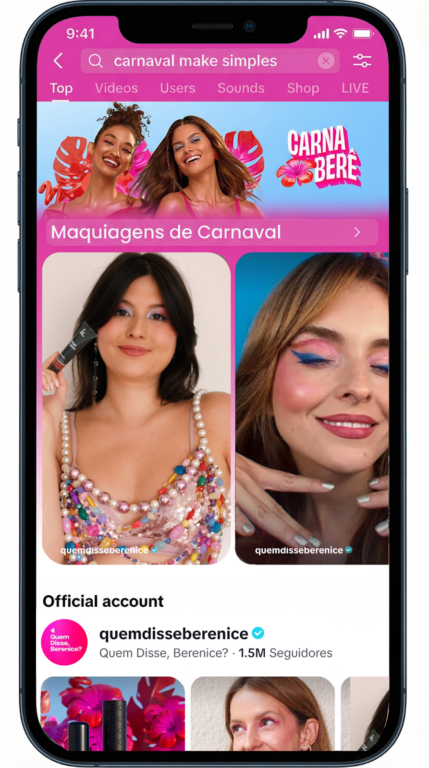 Quem Disse, Berenice? é a primeira marca brasileira de maquiagem a utilizar o Category Search Hub no TikTok para campanha de Carnaval – O Carnaval é um dos períodos mais estratégicos para o mercado de beleza, impulsionando a busca por referências de maquiagem que traduzam criatividade, autoexpressão e experimentação. Atenta a esse comportamento e reforçando seu posicionamento como radar de make, Quem Disse, Berenice? apresenta o Carna Berê com uma estratégia inédita no Brasil: a primeira marca de maquiagem a desenvolver uma campanha com o uso do Category Search Hub do TikTok no país, formato inovador para buscas na plataforma. Com uma estratégia multicanal, que integra ações no digital e no físico, a marca estimula a experimentação de novas produções e reforça a maquiagem como ferramenta de criatividade e expressividade. Consolidando a marca como referência nos conteúdos durante o período carnavalesco, Quem Disse, Berenice? transforma termos como “make de carnaval” e “make que não derrete” em portas de entrada para uma experiência nativa no TikTok por meio do Category Search Hub, conectando o consumidor a uma página dedicada com conteúdos de marca pensados para responder às principais dúvidas e necessidades do público que tem interesse e pesquisa sobre maquiagem para a ocasião.