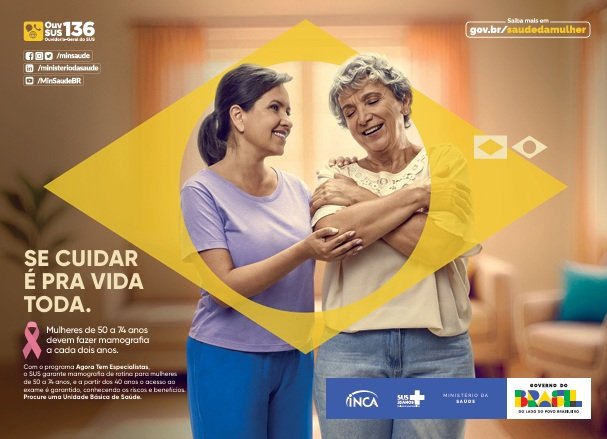 Com presença em TV, rádio, internet e painéis digitais, a ação nacional destaca que o autocuidado, a prevenção e detecção precoce do câncer de mama e do câncer do colo do útero devem ser hábitos permanentes. “Se Cuidar é pra Vida Toda” convida as mulheres brasileiras a adotarem o cuidado com a saúde como um gesto contínuo – não apenas durante o mês de conscientização, mas em todas as fases da vida. A nova campanha busca reforçar a importância do diagnóstico precoce do câncer de mama que pode ser detectado no início, através da mamografia de rotina, para mulheres de 50 a 74 anos, a cada 2 anos, e de práticas preventivas, como alimentação equilibrada, prática de atividade física, controle do peso corporal, não fumar e não consumir bebidas alcoólicas, que contribuem para uma vida mais saudável e plena.