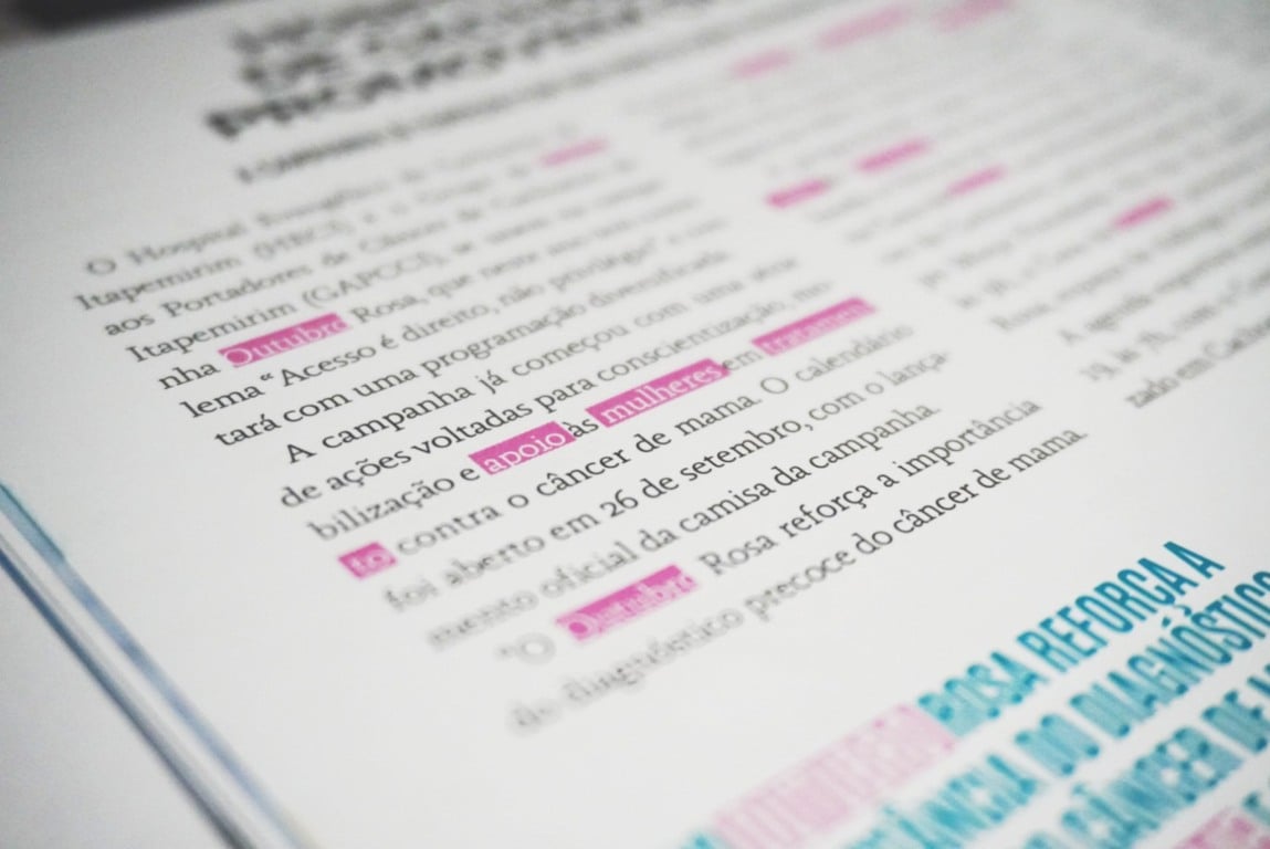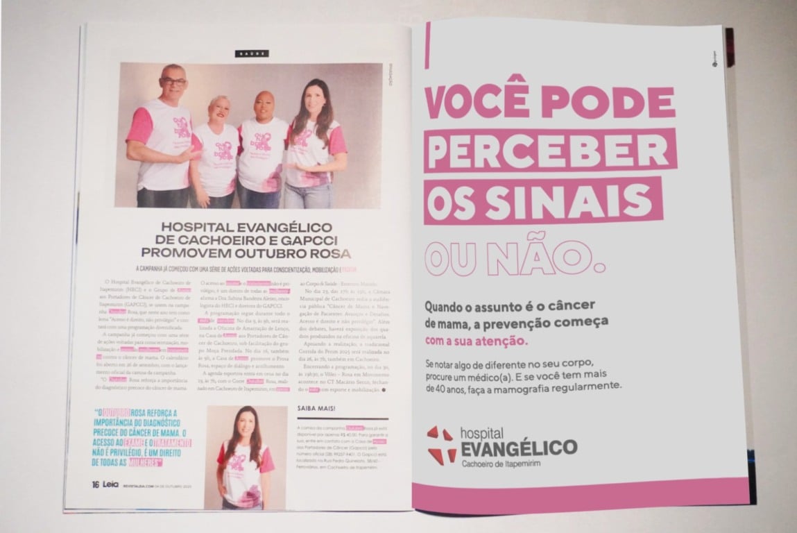 Prósper e Hospital Evangélico de Cachoeiro criam intervenção em revista para o Outubro Rosa – O Hospital Evangélico de Cachoeiro de Itapemirim trouxe para o Outubro Rosa uma ação que levou a conscientização sobre o câncer de mama para dentro das páginas de uma publicação. Assinada pela Prósper Comunicação, a campanha utilizou o próprio conteúdo editorial como suporte criativo, realizando uma intervenção gráfica que desperta curiosidade e engaja o leitor do início ao fim da revista. A ideia partiu do conceito de que é preciso olhar com mais atenção para os sinais e transformou esse raciocínio em experiência sensorial. Em toda a revista, palavras como “mulher”, “mãe”, “filha”, irmã “,”cuidado “,”atenção “,”exame ” e outras relacionadas foram destacadas em rosa, criando uma presença sutil, porém constante, do tema.