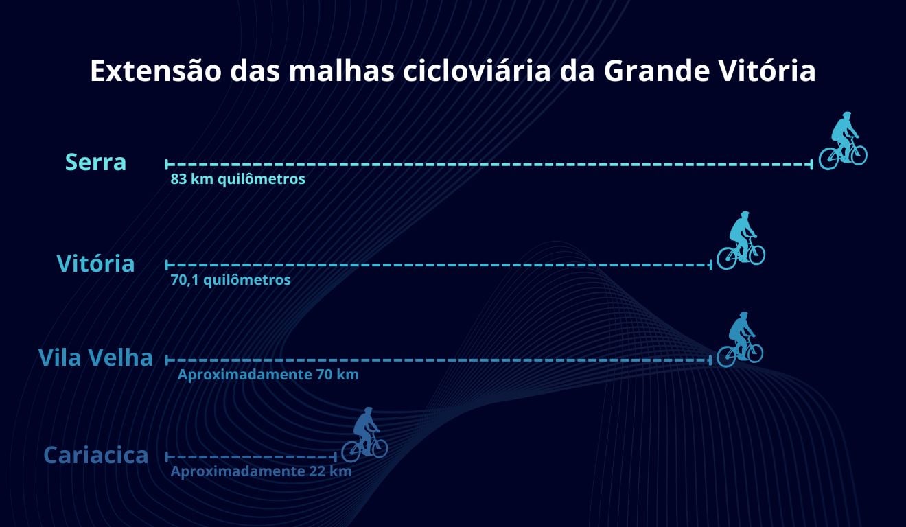 O mesmo se repete em toda a Grande Vitória. Atualmente, segundo dados atualizados pelas prefeituras, o total das redes cicloviárias é: Cariacica, aproximadamente 22 km; Serra, 83 km; Vila Velha 70 km; Vitória 70,1 km.