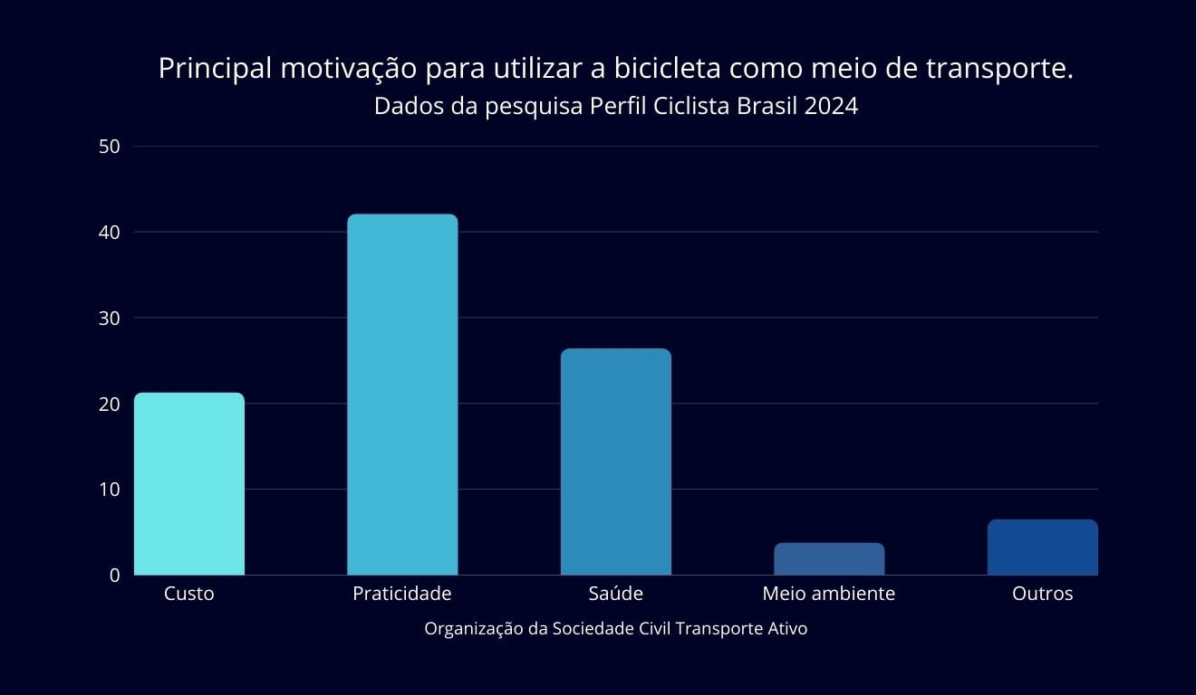 Desses, 42,1% alegou que a principal motivação para adotar a bicicleta era a praticidade e 26,4% pela saúde, seguido de custo (21,3%), outros (6,5%) e meio ambiente (3,8%).