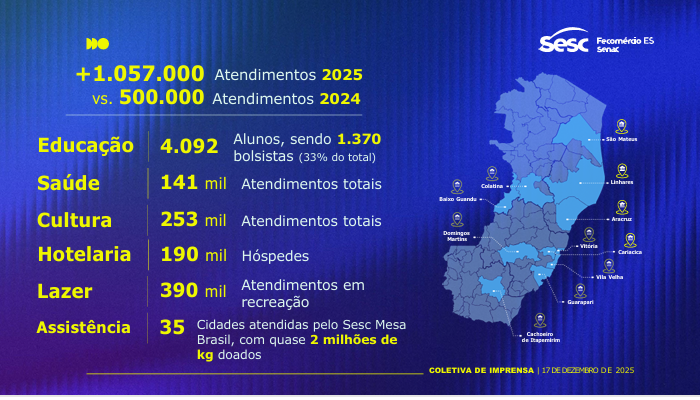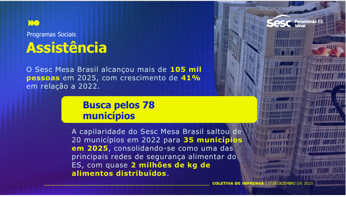 Em Vila Velha, um projeto de R$ 15 milhões modernizará toda a estrutura da unidade, com nova entrada pela Av. Carlos Lindenberg e ampliação dos espaços de convivência e ensino. “A infraestrutura é um meio para ampliar o impacto social. Cada melhoria representa mais conforto, segurança e oportunidades para quem utiliza o Sesc”, destaca Luiz Toniato, diretor regional do Sesc-ES. O compromisso com a inclusão também avança por meio do Sesc Mesa Brasil, que aumentou sua capilaridade em 2025, alcançando 35 municípios. Nos próximos meses, será inaugurada uma nova unidade na Ceasa, em Cariacica. Com investimento superior a R$ 440 mil, a iniciativa ampliará em 20 % a capacidade de arrecadação e distribuição de alimentos, fortalecendo a rede solidária do programa no Estado.