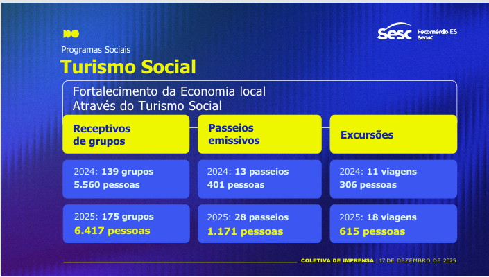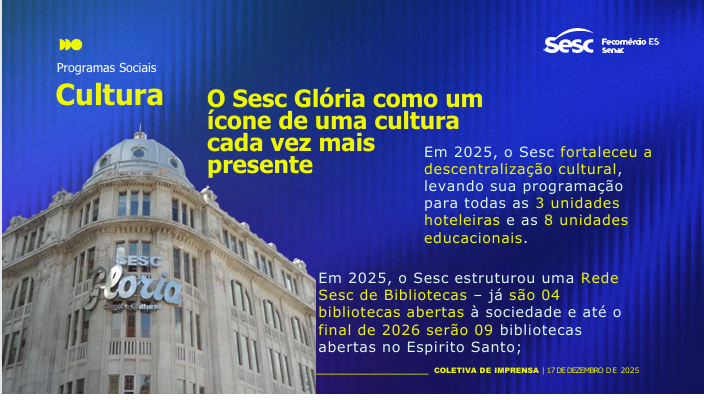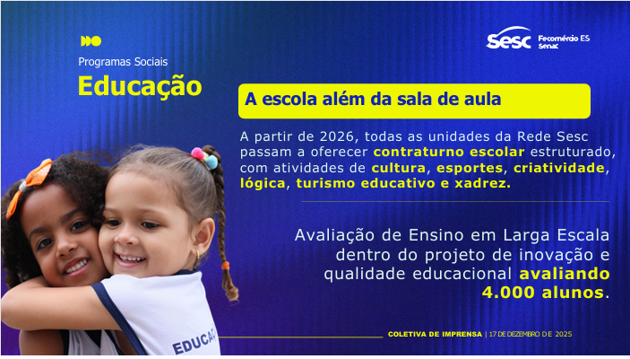 Um legado para o futuro – O Sesc-ES vive um momento histórico. Cada unidade reformada, cada novo serviço e cada ação social representam a consolidação de um legado construído com planejamento, propósito e compromisso público. “Este ciclo é o retrato do que o Sistema Fecomércio-ES acredita: desenvolvimento econômico com inclusão social”, conclui Idalberto Moro. O Sesc Espírito Santo reafirma sua missão de promover qualidade de vida e bem-estar aos trabalhadores do comércio e à sociedade, alinhado ao desenvolvimento de um Espírito Santo que cresce com todos.
