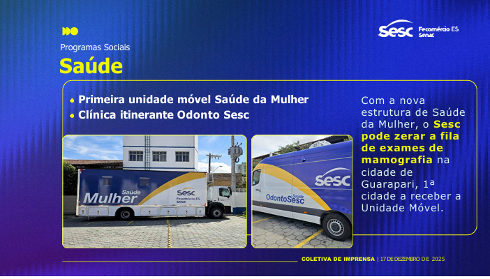 Saúde e bem-estar que chegam a todos – A ampliação das ações de saúde é outro marco deste novo ciclo. Com a chegada da primeira unidade móvel Saúde da Mulher, fruto de um investimento de cerca de R$ 3 milhões, o Sesc-ES reforça o cuidado preventivo e o diagnóstico precoce de doenças, especialmente nas regiões que não possuem o serviço. A primeira cidade a receber a novidade é Guarapari. A parceria com o Sesc-ES permitirá que a fila de espera para exames de mamografia e Papanicolau seja zerada no município, segundo a prefeitura. O projeto OdontoSesc também ganha novo fôlego, com clínica itinerante equipada com tecnologia de ponta, levando atendimento odontológico e ações educativas em todas as regiões do Estado, com um investimento de mais de R$ 500 mil.