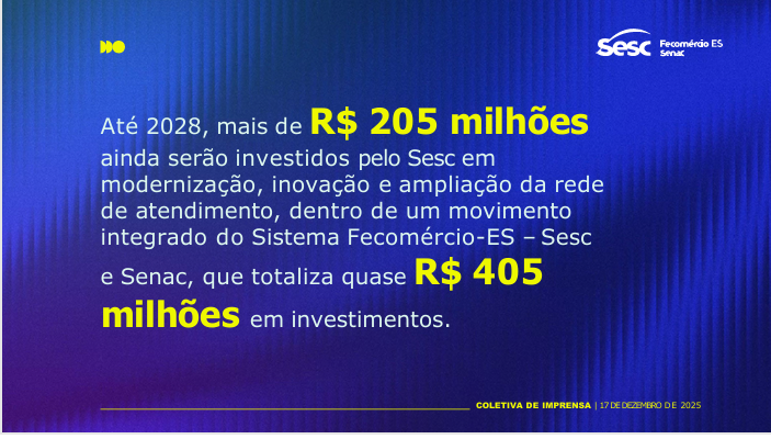 Sistema Fecomércio-ES – Sesc e Senac vai investir mais de R$ 402 milhões até 2028 para modernização estrutural, qualificação das unidades, e fortalecimento da presença em todo o estado – O Sistema Fecomércio-ES – Sesc e Senac está em um novo ciclo de desenvolvimento no Espírito Santo e anuncia um plano de investimentos que soma mais de R$ 402 milhões até 2028, voltado para a modernização estrutural, qualificação das unidades, e fortalecimento da presença em todo o estado e ampliação do acesso aos serviços para empresários, sindicatos empresariais, trabalhadores do comércio e sociedade capixaba. O anúncio foi feito durante coletiva de imprensa realizada nesta quarta-feira (17), no Hotel Senac Ilha do Boi, em Vitória. As ações também buscam fortalecer a atuação institucional das três entidades em todo o Espírito Santo.