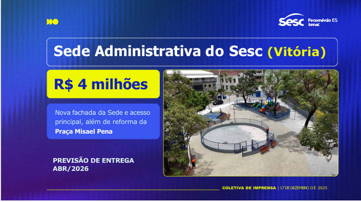 Infraestrutura que transforma – A modernização das unidades físicas é um dos pilares do novo ciclo. O Sesc Colatina passa por ampla reforma, com investimento de R$ 8 milhões, contemplando escola, biblioteca, laboratórios, áreas esportivas e administrativas. O projeto inclui ambientes mais acessíveis e tecnológicos, pensados para o conforto de estudantes, comerciários e comunidade. Na capital, a Sede Administrativa do Sesc, em Vitória, ganha nova fachada e acesso principal. A vizinha Praça Misael Pena, carinhosamente conhecida como “Praça Sesc”, também foi revitalizada, tornando-se um espaço de convivência e fomento ao empreendedorismo local.
