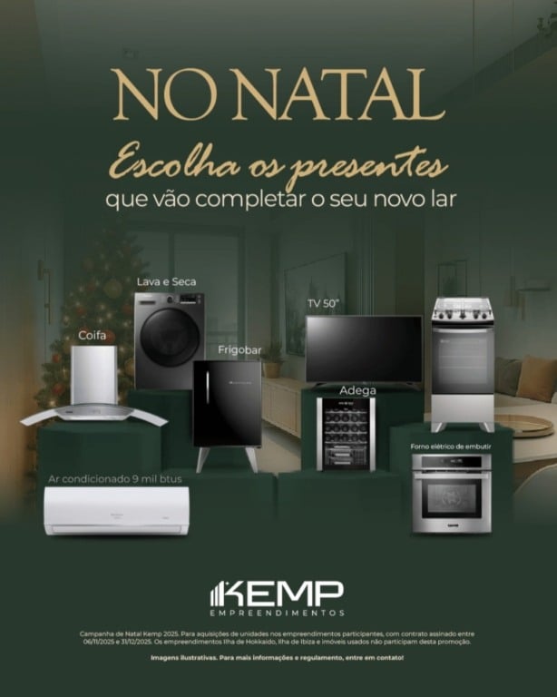 Kemp lança campanha de Natal – A Kemp empreendimentos está com uma campanha de Natal para quem comprar os imóveis da construtora até o dia 31 de dezembro. O cliente que fechar negócio pode escolher entre coifa, frigobar, ar-condicionado, lava e seca, tv 50¨, adega, fogão ou forno elétrico. Não participam dessa promoção os empreendimentos Ilha de Hokkaido, Ilha de Ibiza e imóveis usados.