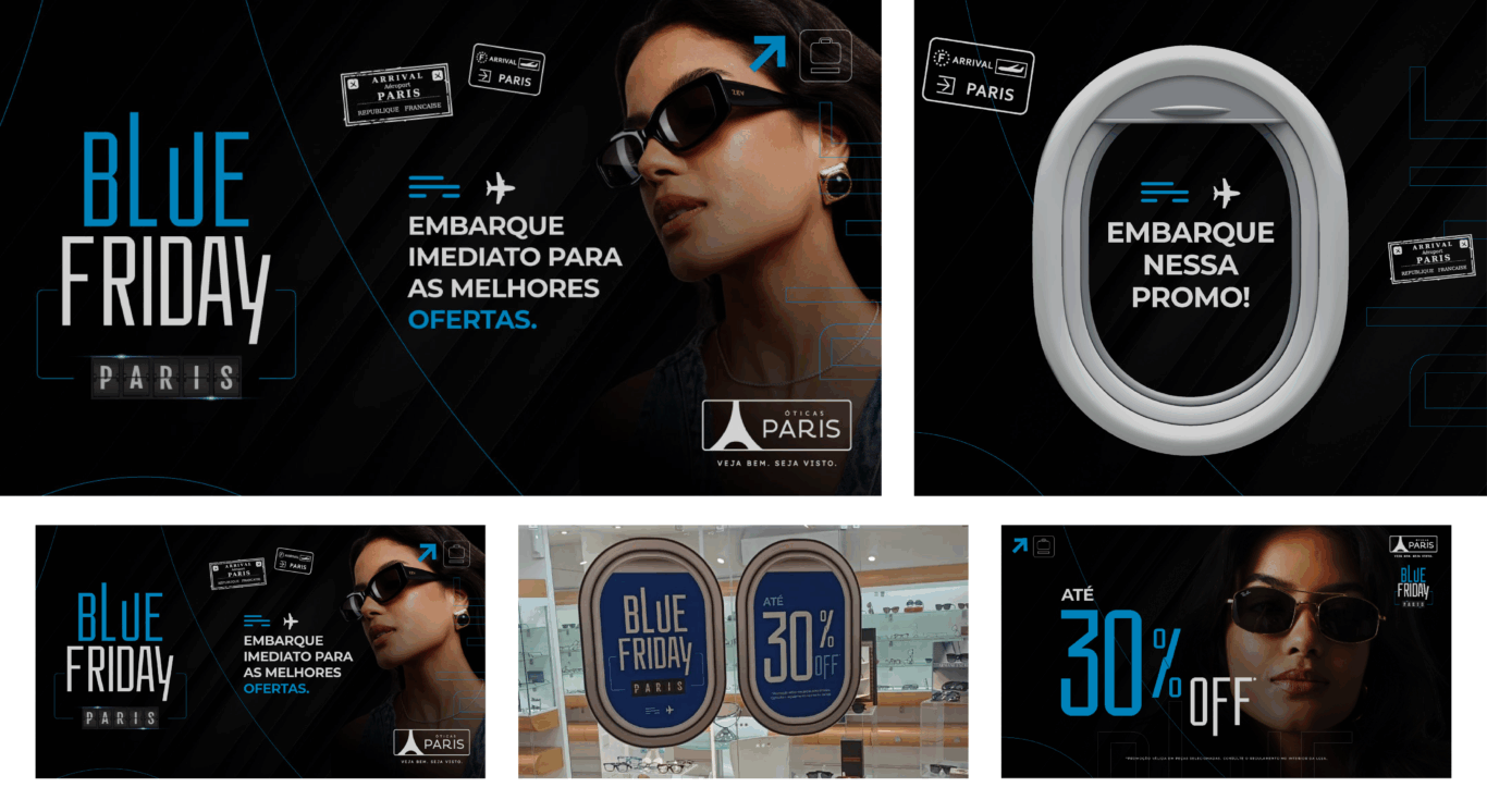 Basta embarcar na Paris mais próxima – Misturando elegância e criatividade, a Blue Friday Paris transforma o ato de comprar óculos em uma experiência premium. Cada detalhe, do som de embarque à locução de bordo, das cores às mensagens nas vitrines, reforça a ideia de que a Paris é o destino certo para quem quer ver o estilo decolar. A campanha se desdobra em VTs, spots de rádio, painéis de LED, materiais digitais e adesivos para as lojas, mantendo o clima de viagem em cada peça. O resultado é uma comunicação integrada e cheia de personalidade, que reafirma o DNA da marca: unir moda e tecnologia com autenticidade em cada detalhe. Com a Blue Friday Paris, a marca mostra que não é preciso atravessar o oceano para viver uma experiência de primeira classe. Basta embarcar na Paris mais próxima.
