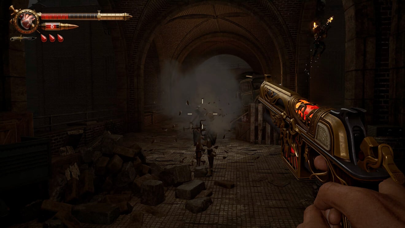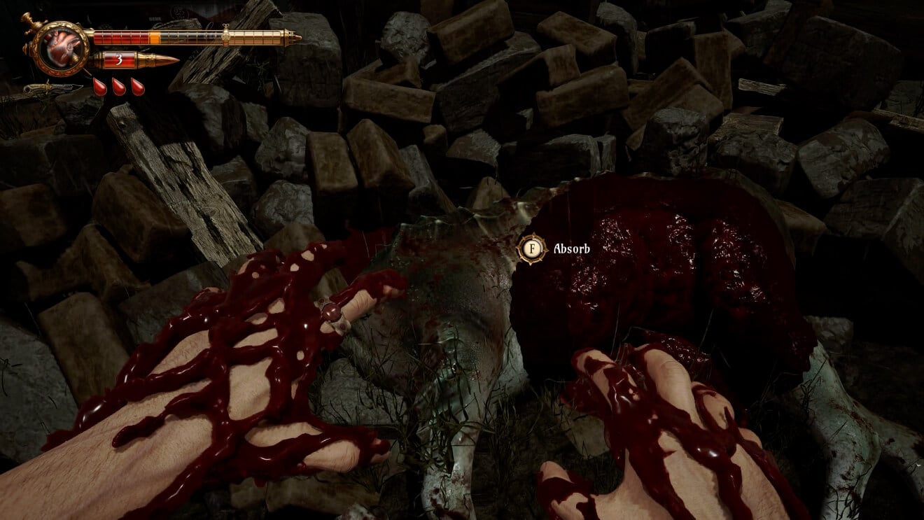 As armas disponíveis — pistola, shotgun e rifle — consomem quantidades diferentes de sangue para recarregar. O processo é brutal: Gabriel se fere diretamente com os próprios armamentos, transformando dor em balas. O jogador decide até onde pode ir, equilibrando sobrevivência imediata e preparo para os próximos encontros.