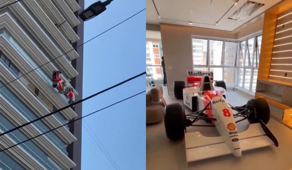 Uma réplica da McLaren dirigida por Ayrton Senna na Fórmula 1 foi içada para um apartamento de um prédio no bairro Tatuapé, em São Paulo. A logística chamou a atenção de vizinhos, que filmaram a cena, e o vídeo viralizou nas redes sociais.