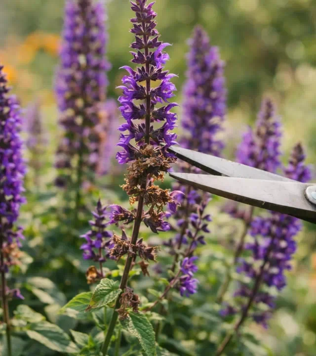Se a sua sálvia-ornamental ainda está firme no final do verão, é hora de planejar uma poda um pouco mais ousada. Essa terceira poda serve como uma espécie de recomeço: você retira grande parte das hastes floridas, mesmo que ainda tenham algumas flores bonitas, para concentrar energia no novo ciclo de crescimento. Pense nela como uma estratégia preventiva.