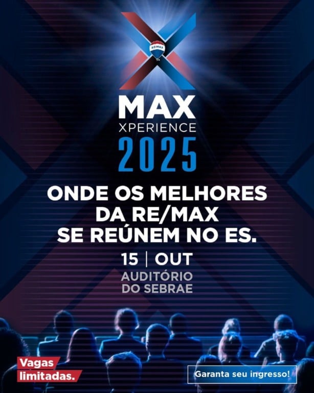 É amanhã, dia 15, o maior evento da RE/MAX no Estado do Espirito Santo – o MAX Xperience, chega em Vitória, amanhã, dia 15, no Auditório do Sebrae, promovendo o dia inteiro de conexões, capacitação e muito conhecimento para acelerar o desenvolvimento de profissionais da rede RE/MAX e convidados do mercado imobiliário. O encontro, que começará a partir das 8h, contará com grandes nomes do setor como o corretor de imóveis e atual membro do Conselho Superior da Ademi-ES, Juarez Soares, o presidente da Ademi-ES, Alexandre Schubert, o presidente do Creci-ES, Manoel Dias, e Thiago Medeiros, diretor regional da RE/MAX Rio Grande do Sul. Link inscrição: https://www.sympla.com.br/evento/max-xperience-2025/3114429