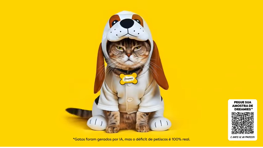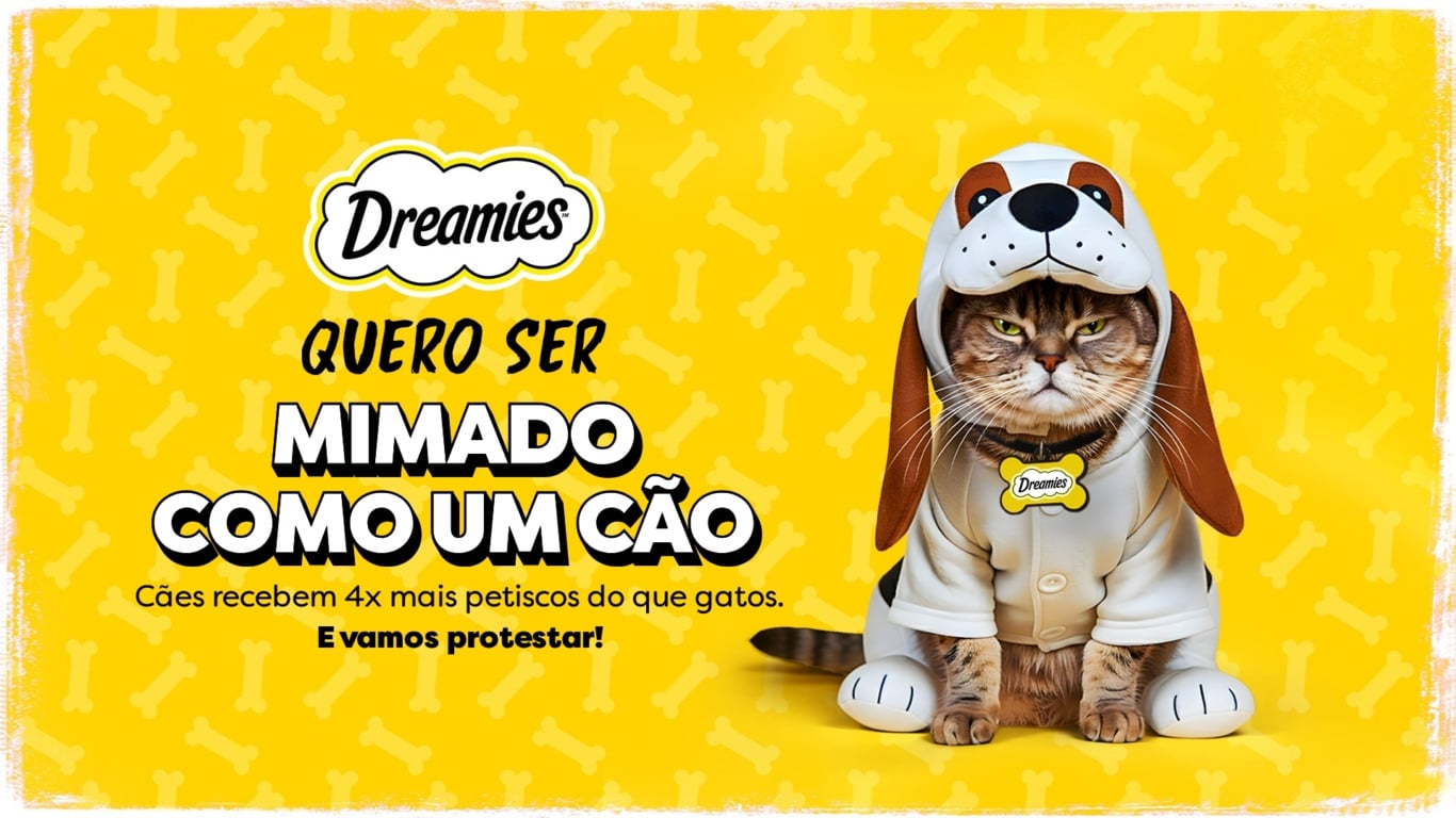 Quero ser Mimado como um Cão – Esse comportamento reforça um mito sobre os gatos, frequentemente vistos como menos afetuosos, apesar de serem ativos, curiosos e altamente engajados em estímulos e brincadeiras. Para marcar o início do movimento “Quero ser Mimado como um Cão”, DREAMIES™ lança o vídeo hero que traduz o racional da campanha e a linguagem divertida e leve da marca. “Toda a identidade visual da campanha traz gatos fantasiados de cachorros, protestando contra o gap existente entre felinos e cães na hora de receberem petiscos”, explica Laura Reis, Gerente de Marketing de DREAMIES™ na Mars Pet Nutrition. “Tradicionalmente Dreamies é uma marca irreverente, moderna e que ao mesmo tempo se preocupa com o bem-estar animal. Por isso, os gatos vestidos de cachorros da campanha foram produzidos com Inteligência Artificial e usam humor, ironia e cultura popular para mostrar que os felinos também têm comportamentos que merecem reconhecimento, estímulos e recompensas”, finaliza Laura.