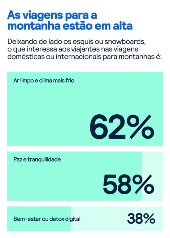 Altitude shift (Mudança de altitude): As montanhas serão verdadeiros refúgios em 2026. Mais do que pelos esportes radicais, elas atraem pela promessa de ar puro, silêncio e bem-estar. “87% dos brasileiros já planejam ou consideram uma viagem para regiões montanhosas no verão ou outono de 2026, o que mostra que o turismo de altitude deixou de ser um nicho e passou a conquistar um público muito mais amplo”, revela Isla.