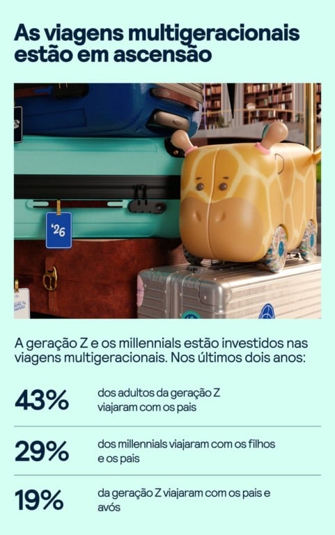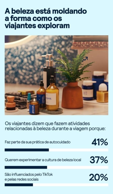 Glowmads (De mãos dadas com a beleza): “Em 2026, 33% dos brasileiros pretendem comprar produtos de beleza e skincare locais durante as viagens, incorporando o autocuidado à experiência de viajar”, afirma Isla dos Santos, especialista em voos e viagens do Skyscanner. A tendência é comum entre todas as gerações: 35% da Geração Z e dos Millennials seguem o movimento, em comparação com 29% da Geração X e 32% dos Boomers. 41% dos entrevistados afirmam que fazem atividades relacionadas à beleza durante a viagem porque faz parte da sua prática de autocuidado, enquanto 37% querem experimentar a cultura de beleza local.