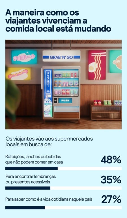 Shelf discovery (Os sabores nas prateleiras): A prática de visitar supermercados durante as viagens consolidou-se como uma forma autêntica de explorar a cultura local. 39% dos brasileiros pretendem conhecer supermercados e mercearias em suas viagens em 2026. Entre os principais motivos estão o desejo de descobrir comidas, lanches e bebidas que não existem no Brasil (48%), encontrar souvenirs acessíveis para presentear (35%) e observar o cotidiano em outros países (27%). “Os supermercados se tornaram quase atrações culturais para os viajantes, oferecendo uma amostra dos hábitos e sabores locais”, analisa Isla.