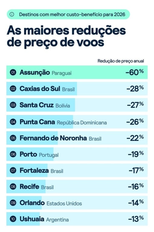 As rotas com maior redução no preço das passagens aéreas em 2026, saindo de São Paulo – Procurando destinos interessantes que não pesem no bolso? Os especialistas do Skyscanner reuniram as tarifas aéreas que registraram as maiores quedas no preço para o próximo ano. “A redução é resultado de fatores como a abertura de novas rotas, o aumento de frequências por companhias aéreas low cost e a retomada de voos diretos, como a rota São Paulo–Porto, recentemente reativada”, explica Bruna.