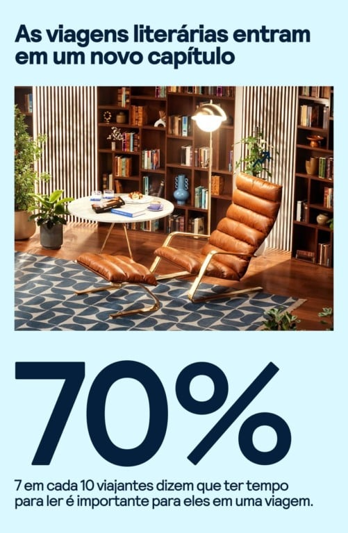 Bookbound (Viagens literárias): 76% dos brasileiros já fizeram ou considerariam fazer uma viagem inspirada pela literatura. “Os livros podem influenciar a escolha dos destinos das pessoas”, revela Isla. Segundo o levantamento, 46% dos brasileiros considerariam visitar um destino mencionado em um livro, 44% incluiriam livrarias ou bibliotecas famosas em seus roteiros e 38% gostariam de conhecer as cidades natais de autores.