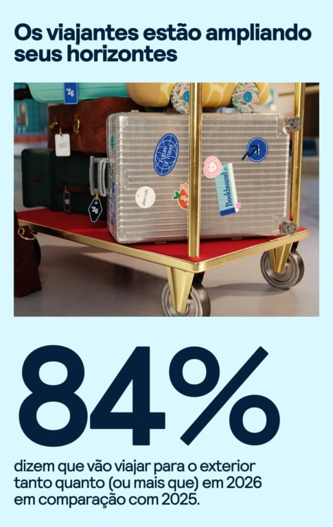 Em resumo, 2026 é o ano em que viajar se torna algo pessoal – Com o custo de vida ainda sendo prioridade para as decisões dos viajantes, as viagens do próximo ano estão sendo planejadas com propósito, moldadas por paixões, prioridades e por uma noção individual do que realmente “vale a pena”. Os dados revelam as principais tendências que irão moldar o comportamento dos viajantes em 2026, abrangendo novos hábitos de consumo, preferências culturais e escolhas de destinos. Entre os destaques estão sete tendências globais que mostram como os viajantes estão redesenhando suas jornadas, além de listas dos destinos mais buscados na plataforma e dos locais com maior queda no preço das passagens aéreas (partindo de São Paulo).