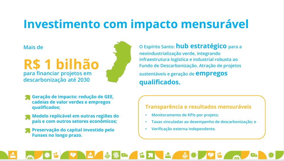 Segundo o diretor-presidente do Bandes, Marcelo Saintive, o lançamento consolida a atuação do banco em agendas de fronteira:“O Fundo de Descarbonização é resultado de uma política pública desenhada para garantir que os investimentos contribuam efetivamente para o cumprimento do pacto de neutralidade de carbono assumido pelo Espírito Santo.” Ele destaca ainda que, nesse contexto, o Bandes, em parceria com a BTG Pactual Asset Management, e apoio do iCS, estruturou uma política de investimentos específica para o Fundo, com princípios, critérios e procedimentos claros, assegurando que os recursos alocados estejam alinhados à transição climática, à redução de emissões e à geração de impacto socioeconômico positivo. “Esse nível de governança e intencionalidade fortalece a economia de baixo carbono, posiciona o Espírito Santo na vanguarda nacional da agenda climática e reafirma o papel do Bandes como referência na integração entre finanças, inovação e responsabilidade ambiental. “