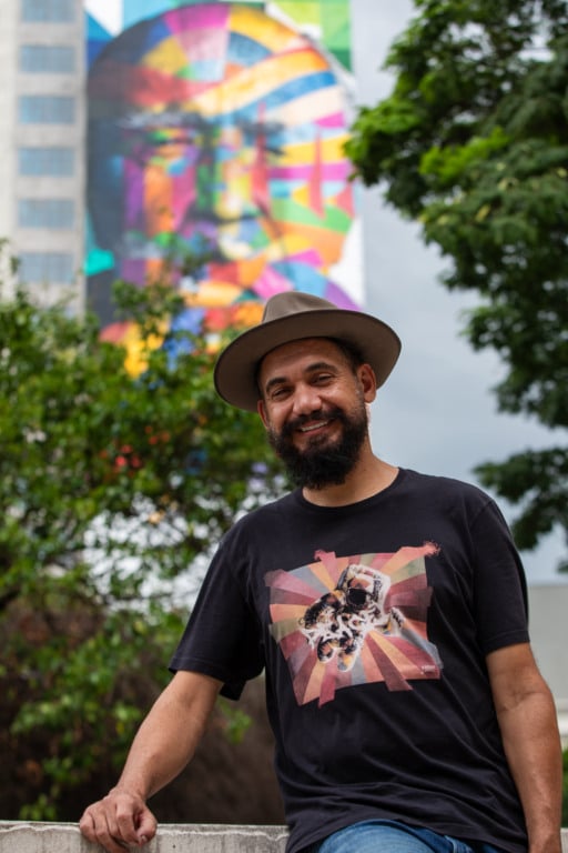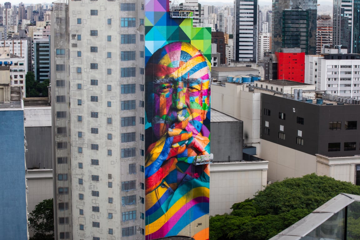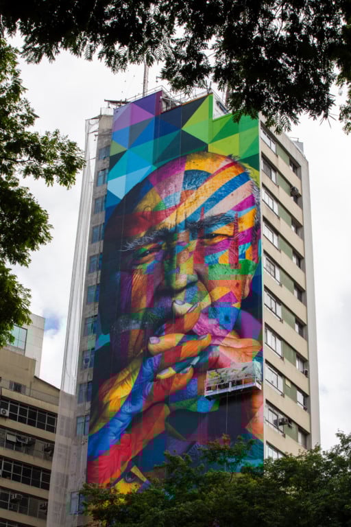 Projeto ganha novas cores para homenagear a cidade em seus 472 anos – A iniciativa reforça a importância da preservação e da renovação da arte urbana. Nas ruas de São Paulo já são mais de cinquenta obras do Kobra. “Esse foi um dos primeiros murais nesse formato em São Paulo e é muito importante na minha carreira, que sempre tem um diálogo com a história e com a memória. Tive a ideia de inserir formas geométricas de grandes edifícios no rosto do grande arquiteto, registrado em foto por Nana Moraes, que autorizou o uso: estão ali o Palácio do Planalto, o Copan, a Pampulha, todos de autoria do Niemeyer”, afirma Kobra, que iniciou um projeto chamado Arte de Restaurar, destinado a recuperar seus grandes murais urbanos. “Sempre quis recuperar esse Niemeyer, e essa tem sido uma das minhas maiores preocupações recentes como artista urbano. Felizmente estamos conseguindo conscientizar entes públicos e parceiros da importância de recuperar essas obras, a quem agradeço”, exalta o artista.