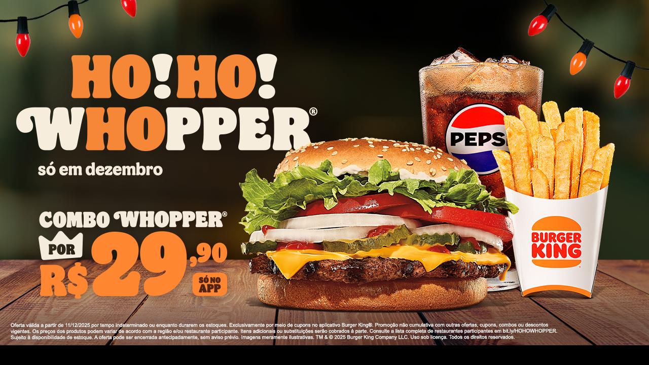 Burger King® antecipa o presente de Natal com cupom de Combo Whopper® a R$ 29,90 – HO! HO! WHOPPER® – O Burger King® decidiu que o presente deste ano vem grelhado no fogo. Com a campanha “HO! HO! WHOPPER®”, que traz uma série de ofertas especiais para celebrar o fim de ano, os fãs da marca poderão aproveitar preços reduzidos nos sanduíches mais icônicos do cardápio, disponíveis exclusivamente através do app do BK®. A estratégia da rede é democrática: tem oferta para quem está sozinho, para quem vai dividir com a galera e para quem não abre mão da sobremesa. Confira a lista completa de ofertas disponíveis no app do BK®. Além disso, por tempo limitado, os membros do Clube BK® poderão resgatar 1 Whopper® por 99 pontos. O benefício é válido por 72h e limitado a 1 unidade por CPF. A oferta é realmente um presente do Papai Noel, afinal atualmente 1 Whopper® custa 230 pontos – ou seja, o sanduíche vai ter mais de 50% de desconto.