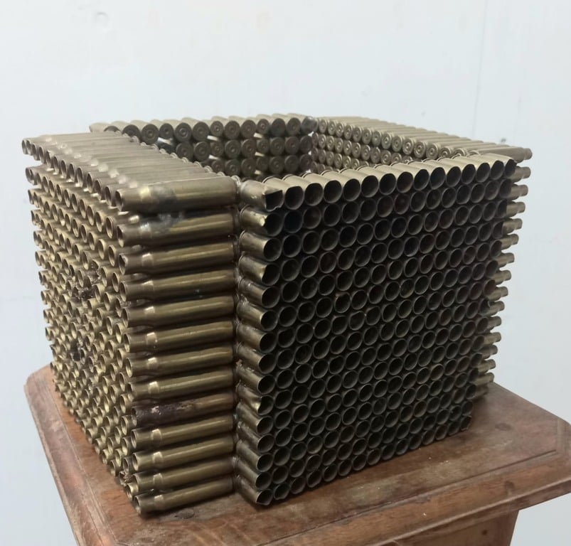 BALEIRO. Este é o titulo de um dos trabalhos do artista Carlos Eduardo Borges apresentado no encontro Arte+ (Atelier FA. setembro 2025). Trata-se de uma pequena escultura participativa, feita com cartuchos de pistolas e fuzis recolhidas após tiroteios na comunidade Vigário Geral, Rio de Janeiro.