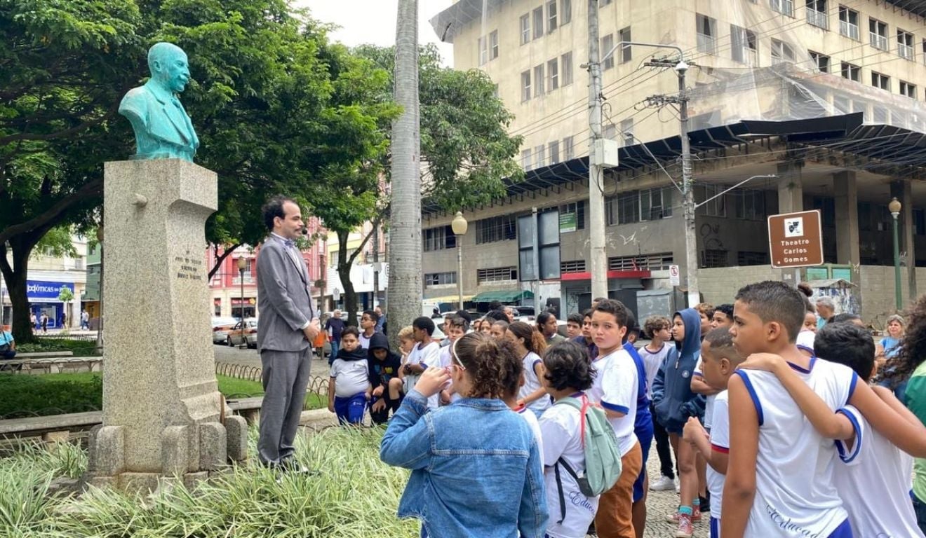 Os personagens históricos caminham pelo local e recebem educadores, que também contribuem com seus conhecimentos.