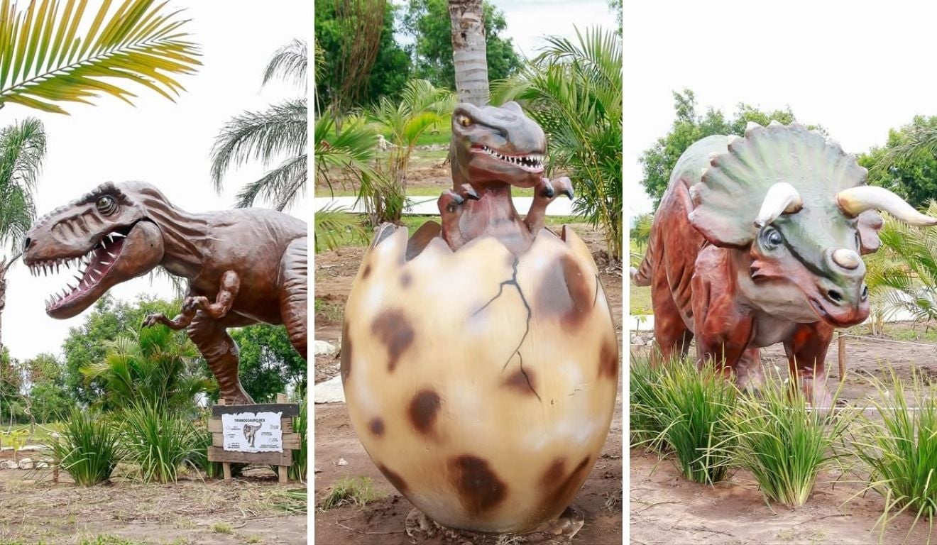 Os dinos estão espalhados pelo espaço: tem réplicas de tiranossauro rex, triceratops, braquiossauro, entre outros animais pré-históricos.