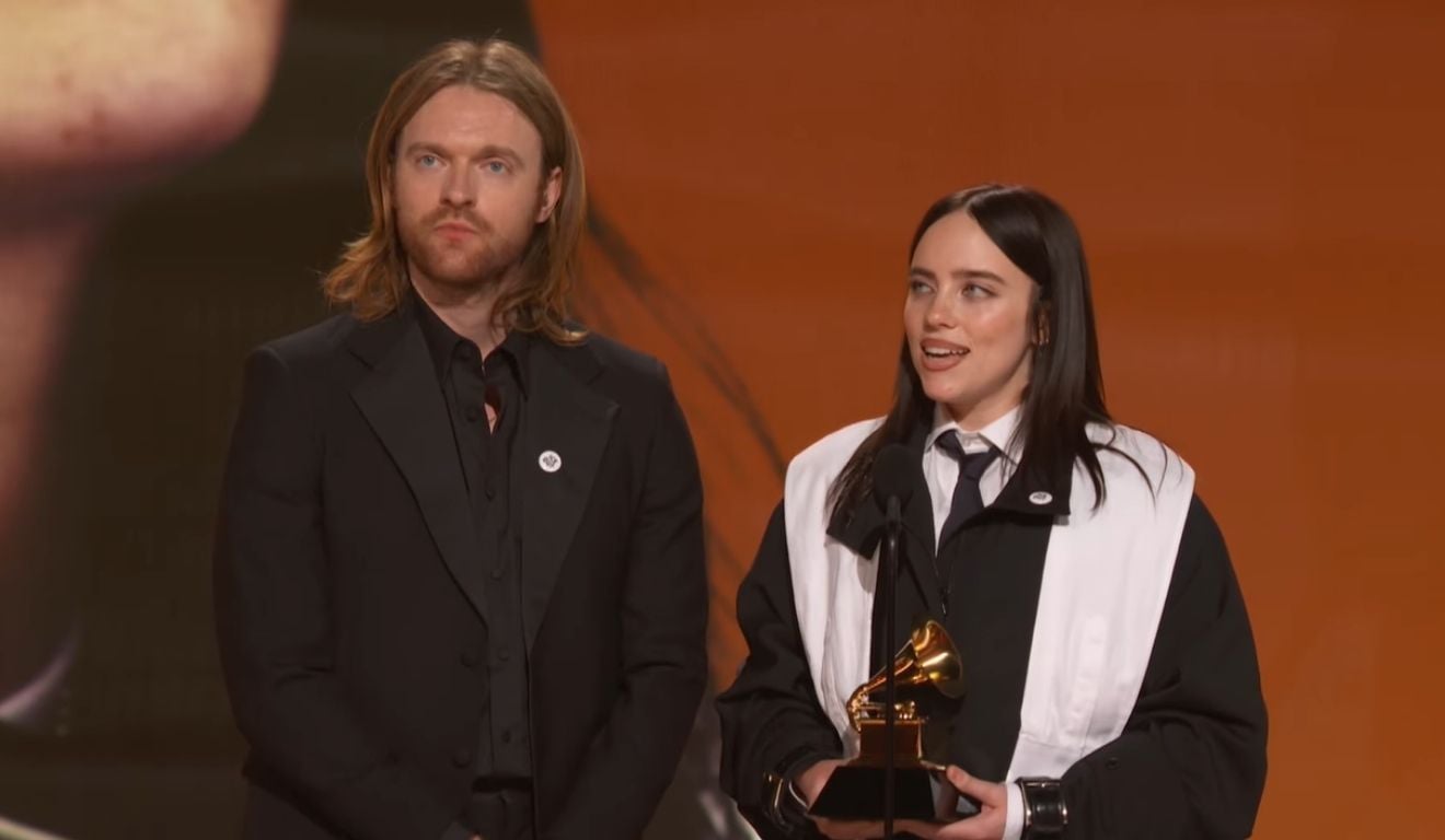 Finneas e Billie durante discurso de agradecimento pelo Grammy (Foto: @RecordingAcademy via Youtube)