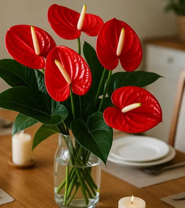 Usar o antúrio na decoração da mesa de jantar é uma daquelas escolhas certeiras para quem quer impressionar. Além de visualmente impactante, a flor simboliza hospitalidade e harmonia, tornando cada refeição um momento especial. O segredo está em equilibrar o destaque da planta com o restante da composição: toalhas neutras, louças simples e velas suaves ajudam a realçar o brilho natural das flores.