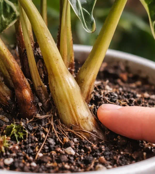 Aprender a observar o caule da Alocasia-polly muda completamente a forma de cultivo. Ele funciona como um termômetro do equilíbrio hídrico da planta. Firmeza indica estabilidade. Amolecimento progressivo indica que algo está errado — quase sempre relacionado à água em excesso.