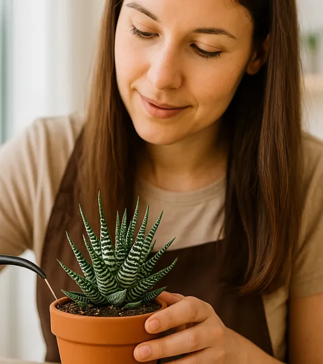 A suculenta Haworthia é nativa de regiões áridas, e suas raízes foram feitas para absorver água em curtos períodos de chuva. Isso significa que ela precisa de regas espaçadas, mas generosas. O erro mais comum é o “pouquinho todo dia”, que mantém o substrato úmido por tempo demais e apodrece as raízes.