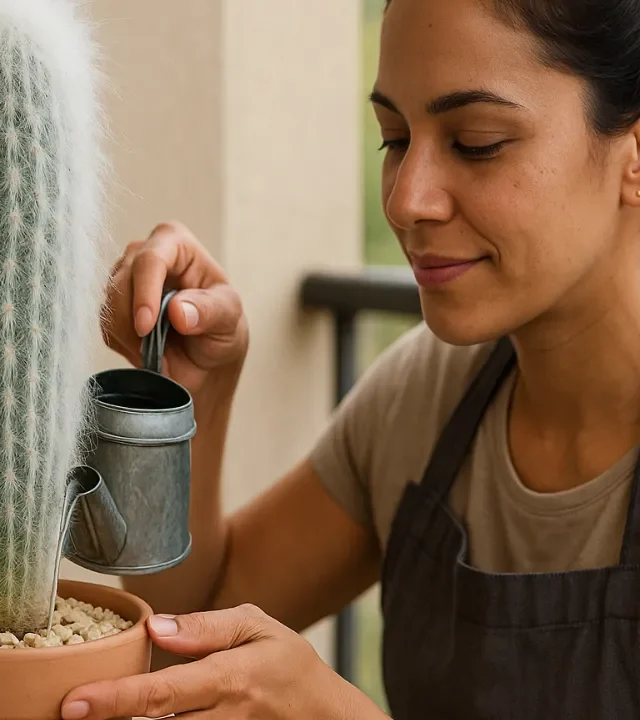 Os erros mais comuns com o cacto Velho-dos-Andes são luz insuficiente, rega frequente e vasos sem drenagem. Sinais de alerta: alongamento exagerado (falta de luz), base encharcada ou odor azedo (excesso de água) e manchas amareladas sob a penugem (queimadura ou início de apodrecimento). Sobre pragas, cochonilhas podem se esconder no “casaco” branco. Inspecione as axilas dos espinhos; se notar pontos pegajosos ou amarelados, use um cotonete com álcool isopropílico, tocando com leveza apenas nos focos. Em infestações maiores, opte por óleo mineral diluído, aplicado com pincel macio, sempre fora do sol e com boa ventilação. Lembre: a penugem é escudo, não precisa brilhar; evite “banhos cosméticos”.