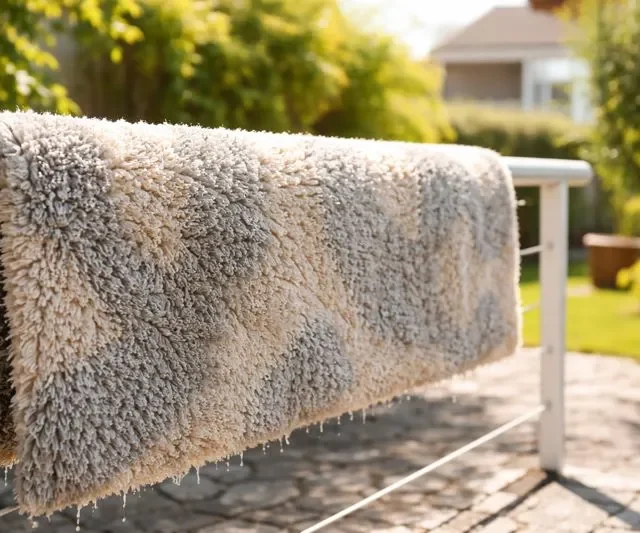 O ideal é pendurá-lo de forma que o ar circule pelos dois lados, evitando deixá-lo dobrado ou apoiado apenas em uma superfície. Sol indireto ajuda muito, assim como vento. Em dias úmidos, usar um ventilador direcionado ao tapete faz toda a diferença.