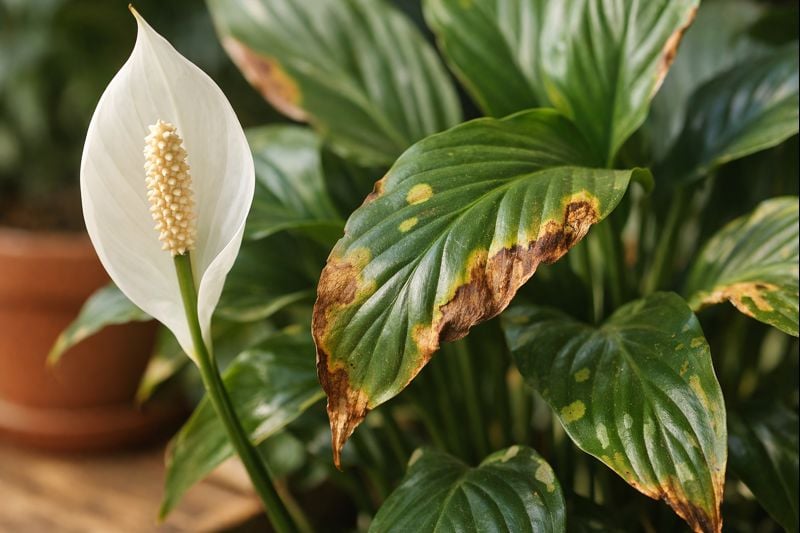 Pouca gente desconfia, mas o excesso de zelo pode ser exatamente o que está prejudicando seu lírio-da-paz. Aqueles pontinhos escuros nas folhas, o aspecto “queimado” ou até a aparência amarelada com textura pegajosa na planta não significam necessariamente doença. Em muitos casos, o problema está vindo do borrifador — mais precisamente do excesso de pulverização. Sim, aquilo que você faz para ajudar a planta a “refrescar” pode, sem querer, sufocar suas folhas e abrir caminho para fungos silenciosos.